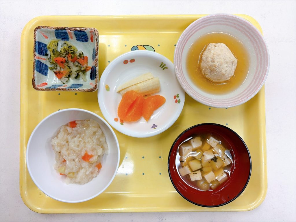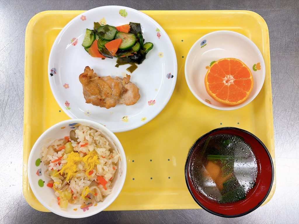 お知らせ 2025年11月21日(金) 今日の給食 幼児食 秋の味ごはん・ほうれん草のみそ汁・鶏肉の生姜焼き・胡瓜とわかめの酢の物・みかん 離乳食 秋の味雑炊・ほうれん草のみそ汁・鶏肉団子の照り煮・わかめの和え物・みかんとバナナ