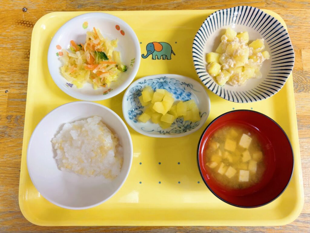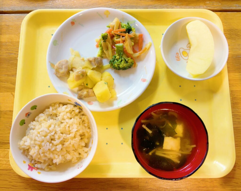 お知らせ 2025年12月16日(火) 今日の給食 幼児食 玄米ごはん・わかめとねぎのみそ汁・チキンジャーマンポテト・ブロッコリーのオイマヨ和え・りんご 離乳食 軟飯・わかめとねぎのみそ汁・チキンジャーマンポテト・キャベツサラダ・煮りんご
