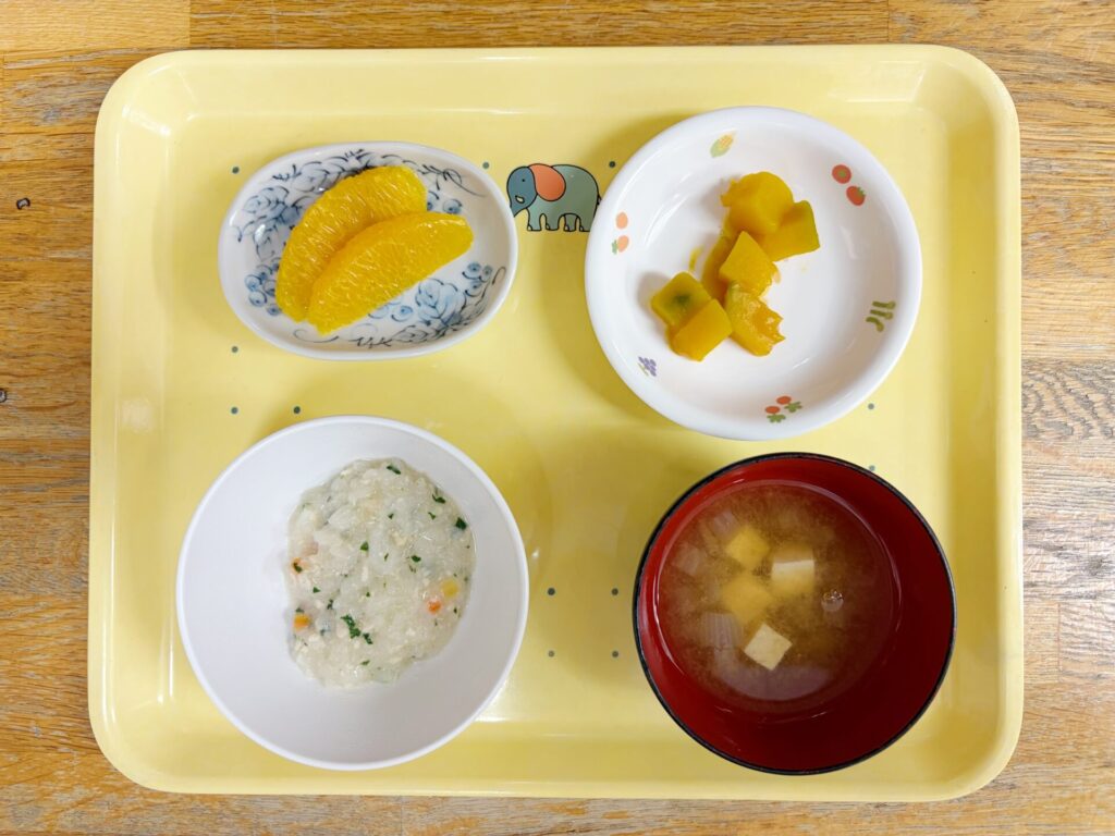 鶏雑炊・大根のみそ汁・南瓜のうま煮・オレンジ