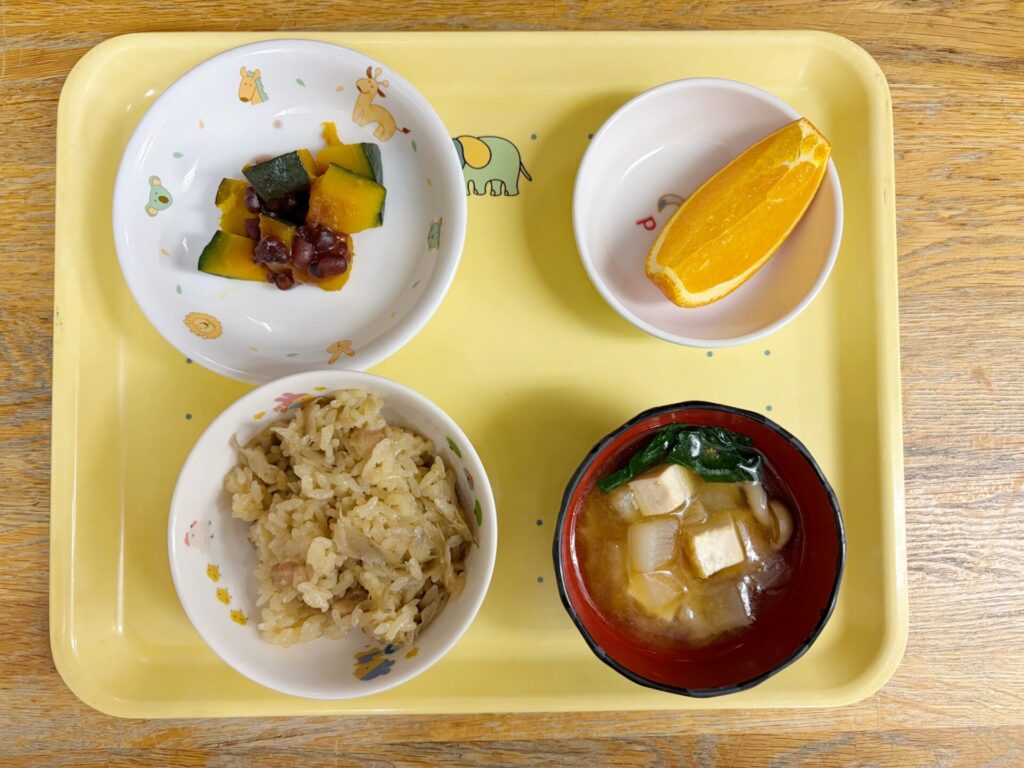 鶏ごぼうご飯・大根のみそ汁・冬至かぼちゃ・オレンジ