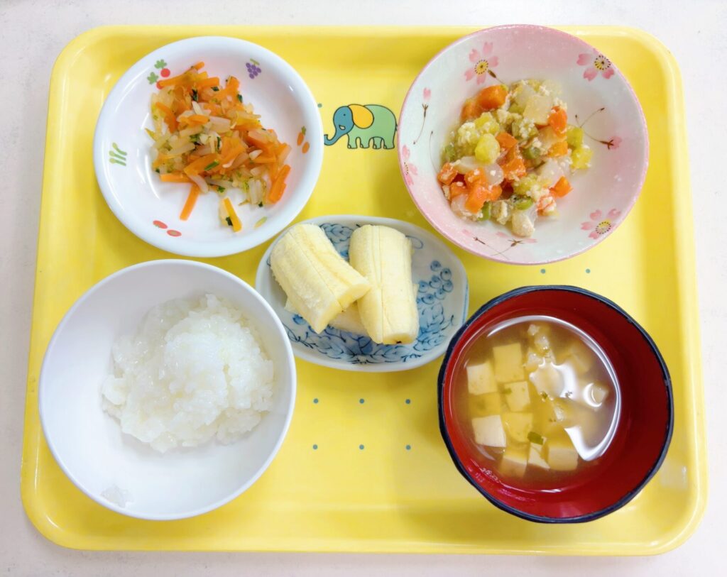 軟飯・わかめ汁・かぶと鶏肉煮・三色野菜の和え物・バナナ