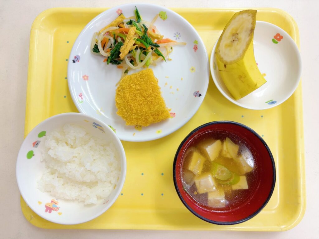 ご飯・鶏とごぼうのみそ汁・ミートコロッケ・三色野菜のナムル・バナナ