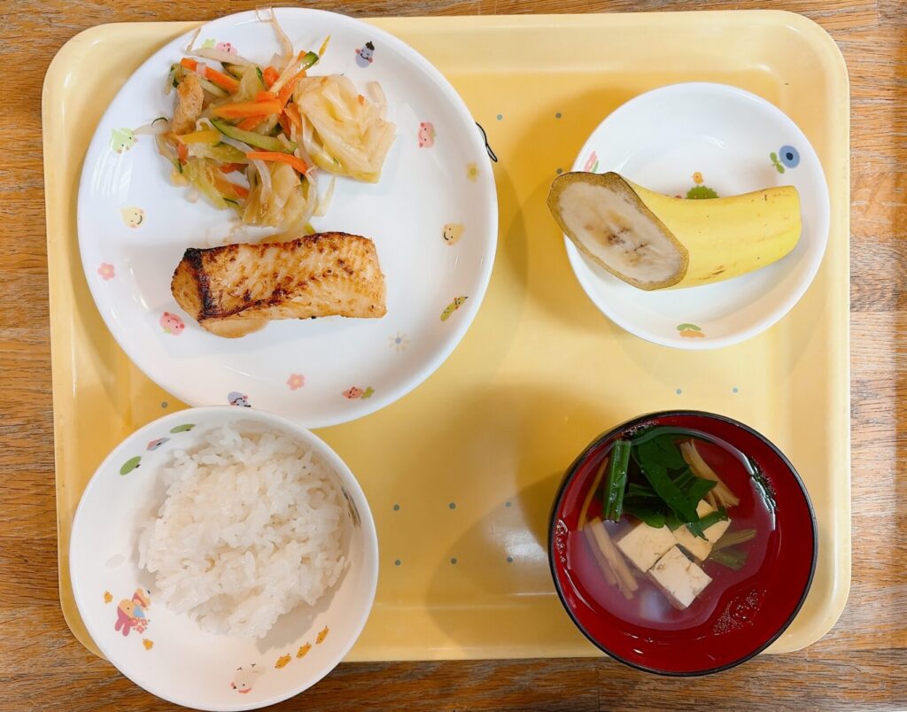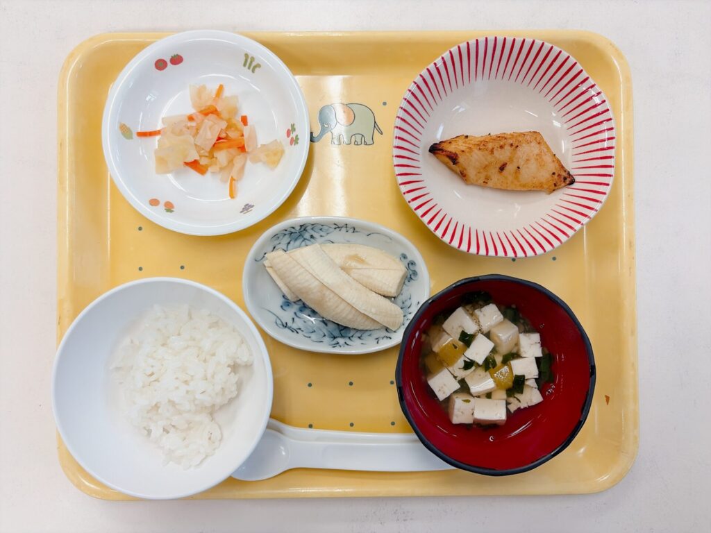 ごはん・すまし汁・魚の甘味噌焼き・野菜の梅肉和え・バナナ