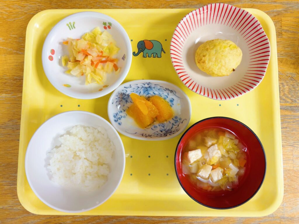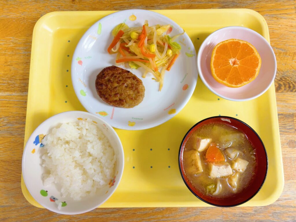 お知らせ 2025年12月15日(月) 今日の給食 幼児食 ごはん・豚汁・ハンバーグ・もやしとコーンのサラダ・みかん 離乳食 軟飯・具だくさん汁・鶏肉とじゃが芋のつぶし焼き・もやしとコーンのサラダ・みかん