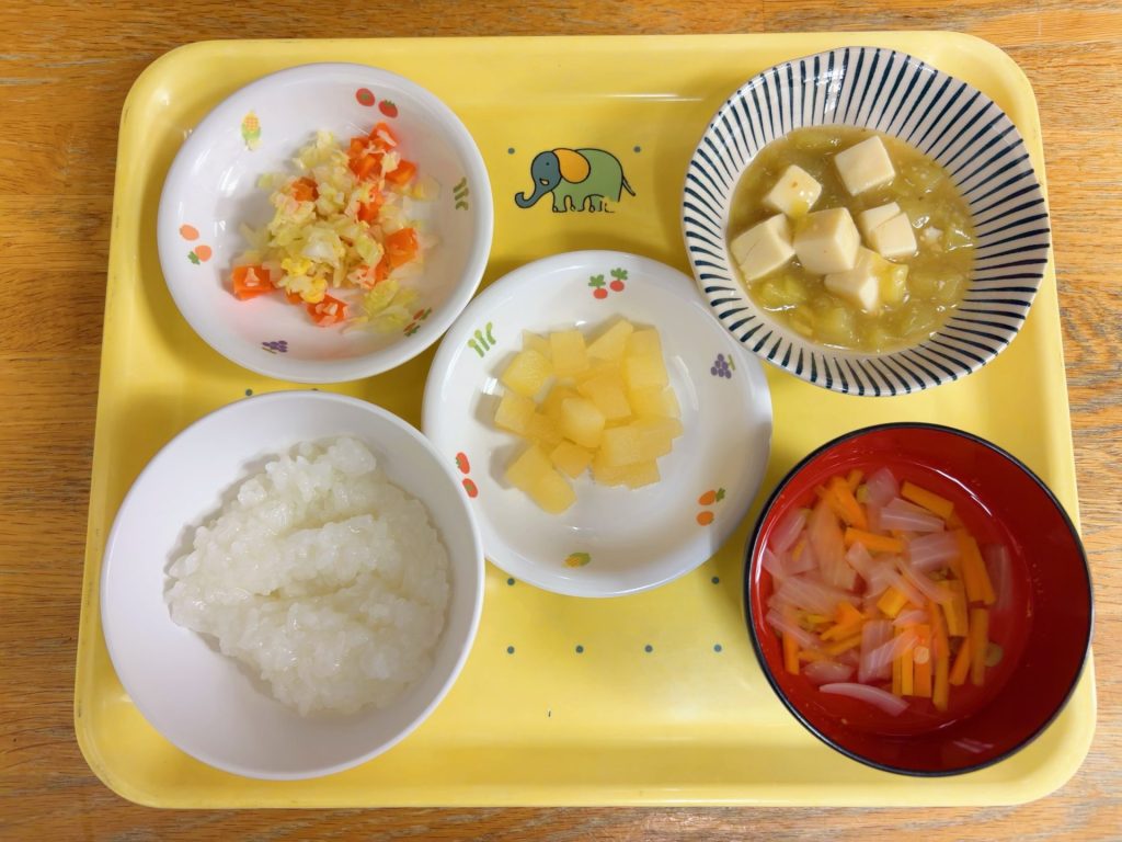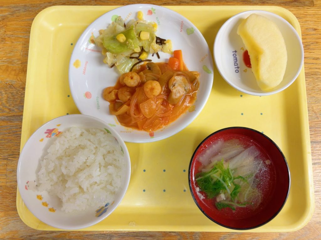 今日の給食 幼児食 ご飯・白菜とじゃが芋の生姜スープ・エビチリ・キャベツとコーンの塩昆布和え・りんご 離乳食 軟飯・玉ねぎのスープ・茄子と豆腐の味噌だれ・キャベツとコーンのサラダ・煮りんご お知らせ | 保育所型認定こども園 美咲の森こども園|鶴岡市 見守る保育 きみもおいでよ おとぎの国へ