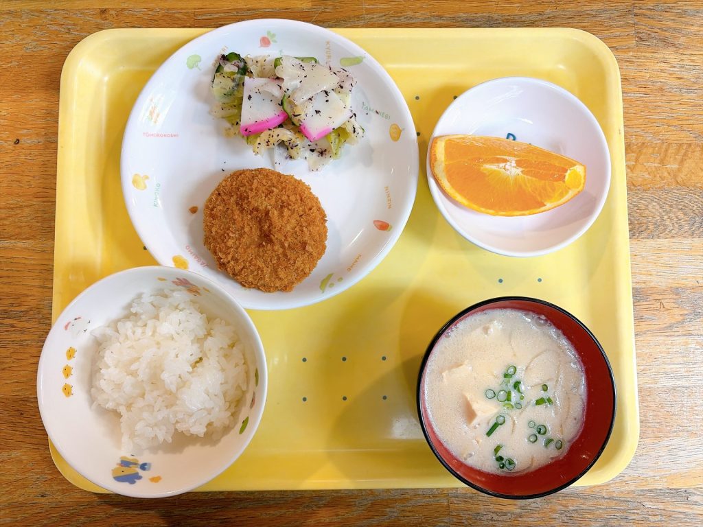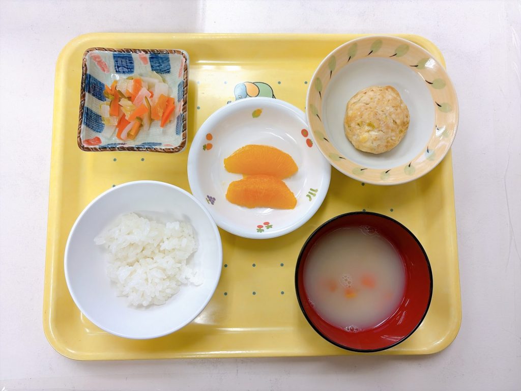 今日の給食 幼児食 ごはん・豚骨風豆乳春雨スープ・豚カツ・キャベツと大根のゆかり和え・オレンジ 離乳食 軟飯・豆乳春雨スープ・鶏つくね焼・大根サラダ・オレンジ お知らせ | 保育所型認定こども園 美咲の森こども園|鶴岡市 見守る保育 きみもおいでよ おとぎの国へ